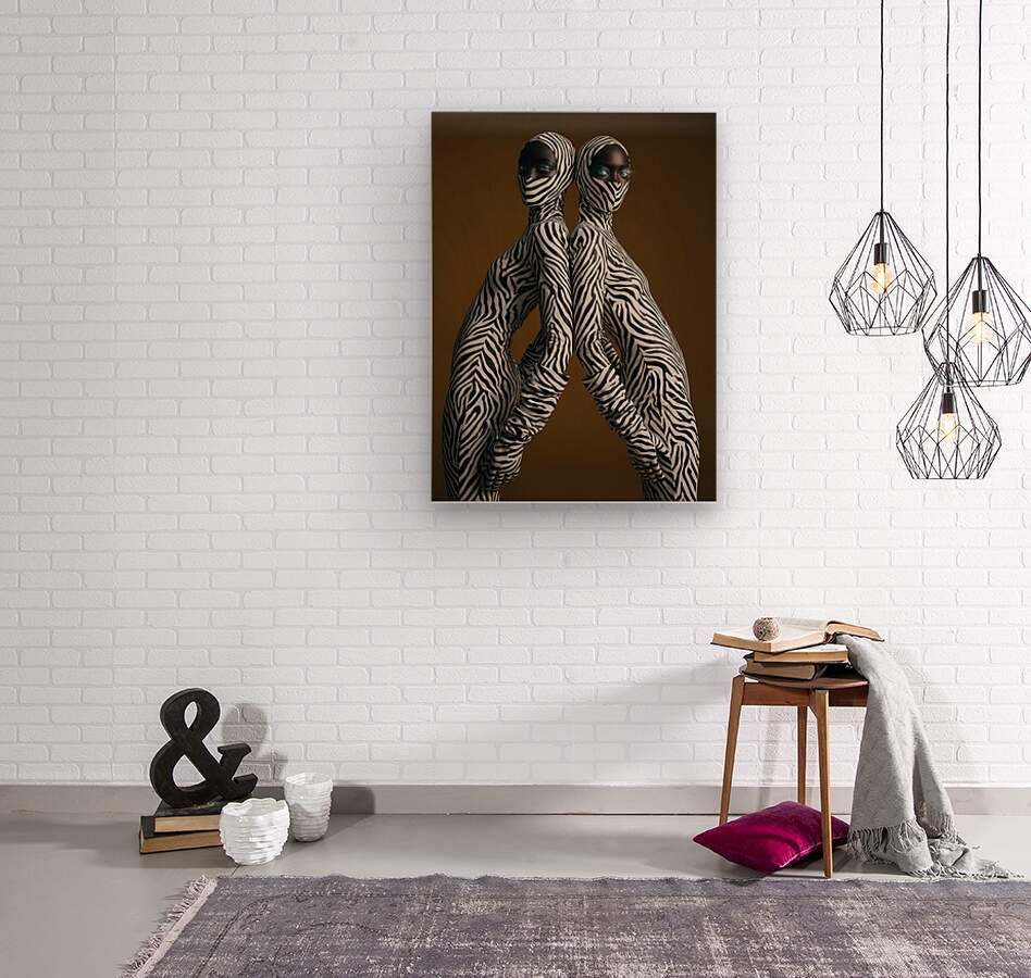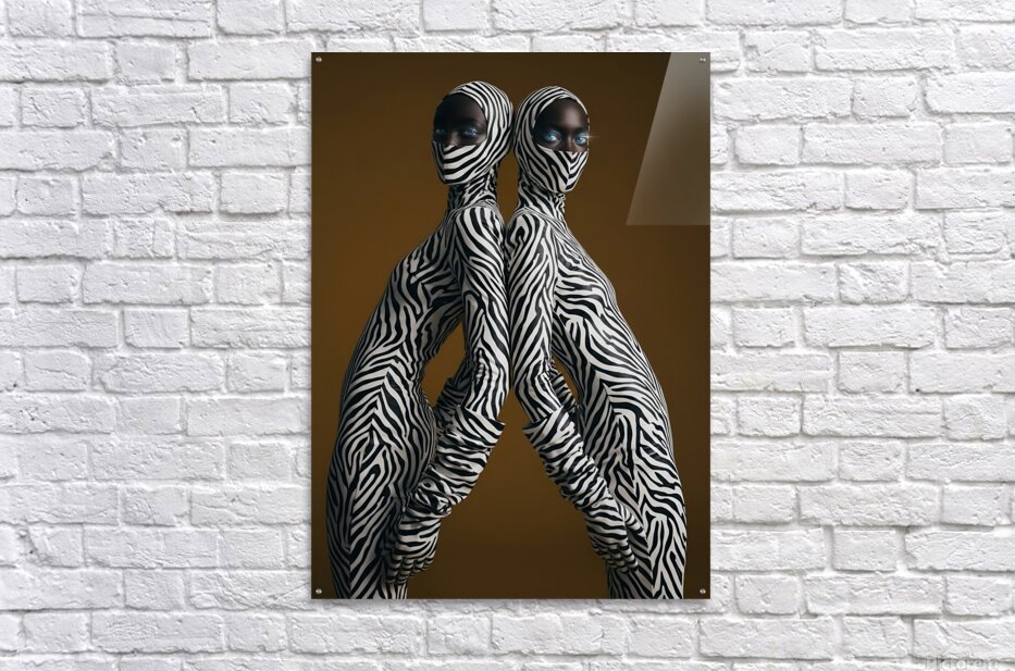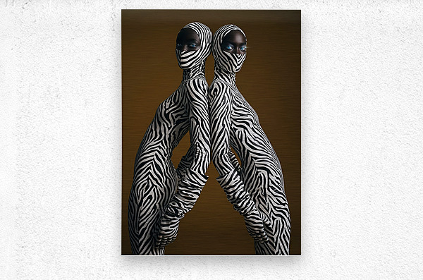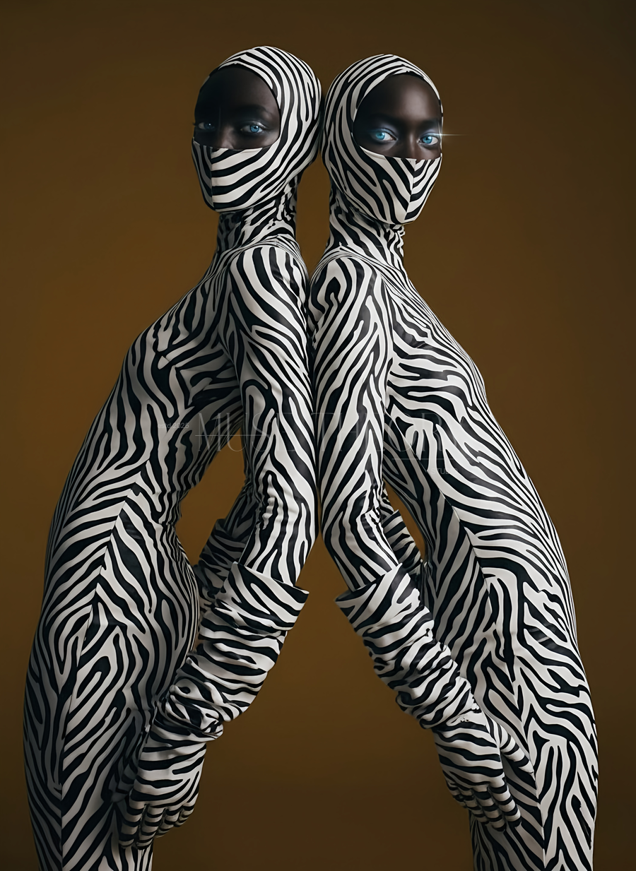 Mirrored silhouettes unified in zebra abstraction, creating a futuristic vision of connection, contrast, and cosmic femininity.